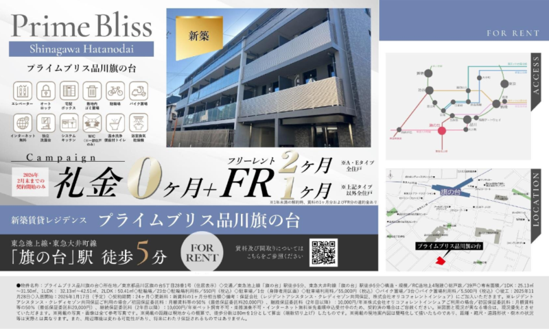 【プライムブリス品川旗の台 】を初期費用16万円・フリーレント1ヶ月で入居する方法!